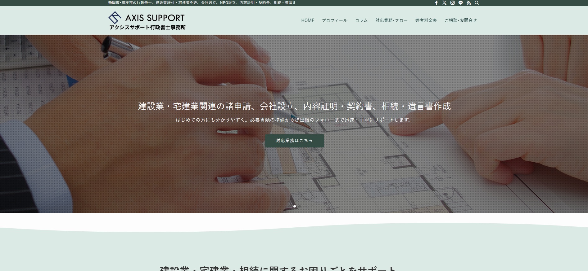 アクシスサポート行政書士事務所 様 2026 2/09 WEBサイト 2025年11月13日2026年2月9日 テーマSWELL業種士業(行政書士)URLhttps://axis-gyosei.uma2park.com/制作年月日2025.11.3 ご相談・お問合せはこちら WEBサイト よかったらシェアしてね! URLをコピーしました! URLをコピーしました! アクシスFP事務所 様 この記事を書いた人 axis-kikaku 関連記事 遺言・相続相談所 藤枝・焼津 2026年2月9日 古物商許可サポート@藤枝・焼津 様 2026年2月9日 輝塾 様 2025年11月14日 ナチュラルボディIZUMI 様 2025年11月13日 アクシスFP事務所 様 2025年11月13日