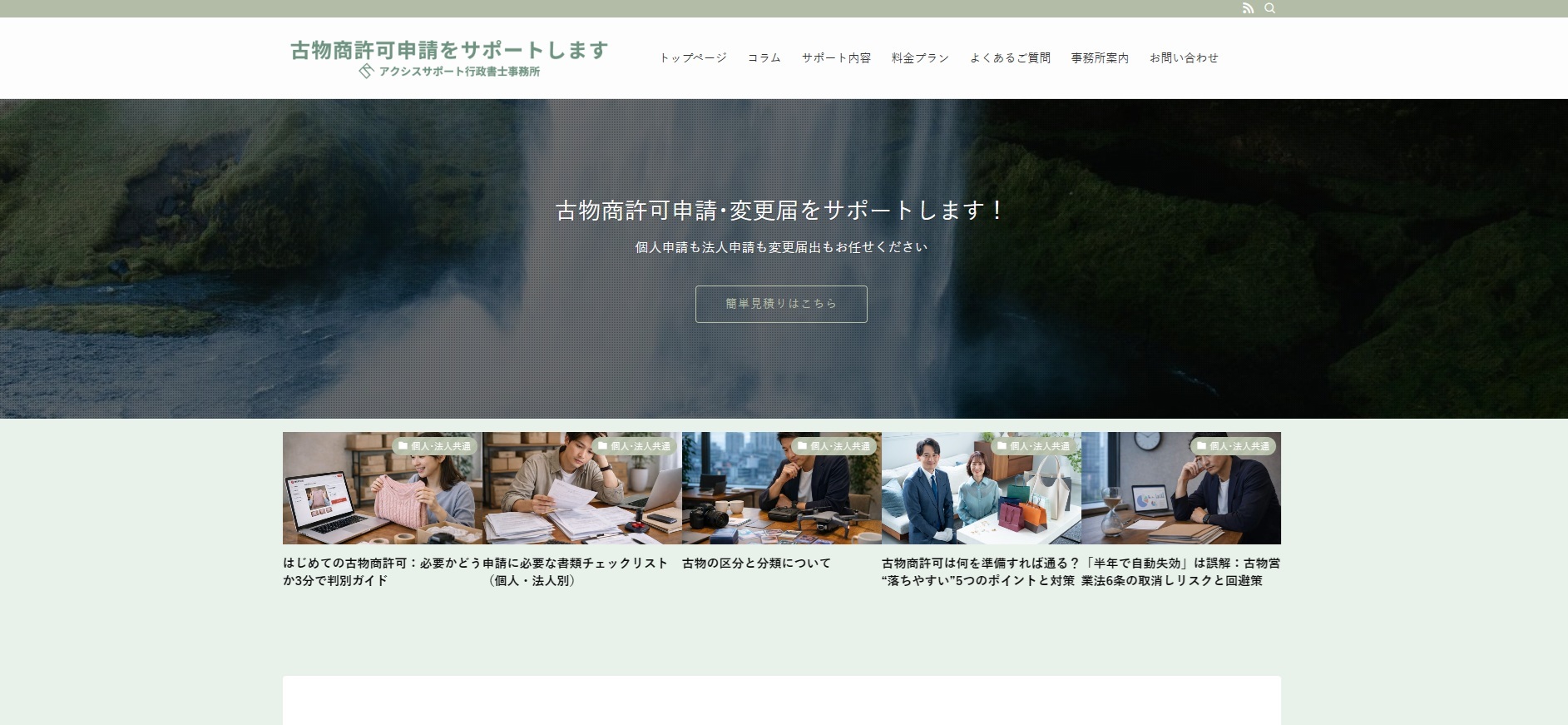 古物商許可サポート@藤枝・焼津 様 2026 2/09 WEBサイト 2026年2月9日 テーマSwell業種行政書士URLhttps://kobutsu-shizuoka.uma2park.com/制作年月日2026.2 ご相談・お問合せはこちら WEBサイト よかったらシェアしてね! URLをコピーしました! URLをコピーしました! 輝塾 様 遺言・相続相談所 藤枝・焼津 この記事を書いた人 axis-kikaku 関連記事 遺言・相続相談所 藤枝・焼津 2026年2月9日 輝塾 様 2025年11月14日 ナチュラルボディIZUMI 様 2025年11月13日 アクシスFP事務所 様 2025年11月13日 アクシスサポート行政書士事務所 様 2025年11月13日 コメント コメントする コメントをキャンセルコメント ※ 名前 ※ メール ※ サイト 次回のコメントで使用するためブラウザーに自分の名前、メールアドレス、サイトを保存する。 Δ